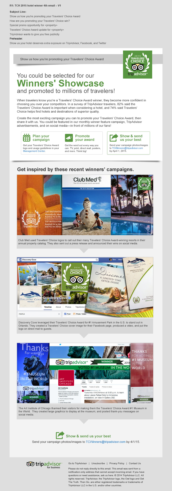 The Travelers' Choice Awards celebrate the best properties and destinations in the world, based on millions of reviews and opinions from the travelers themselves. To ensure that this year's hotel winners know about their award and promote it, I wrote a series of four emails offering a free award plaque, sharing promotional tools and ideas, and encouraging the winners to share their biggest and best promotions for a chance at additional exposure on TripAdvisor and social media.